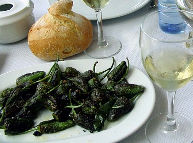 Padrón peppers – fried peppers sprinkled with coarse salt — most are mild, but some are fiery surprises.